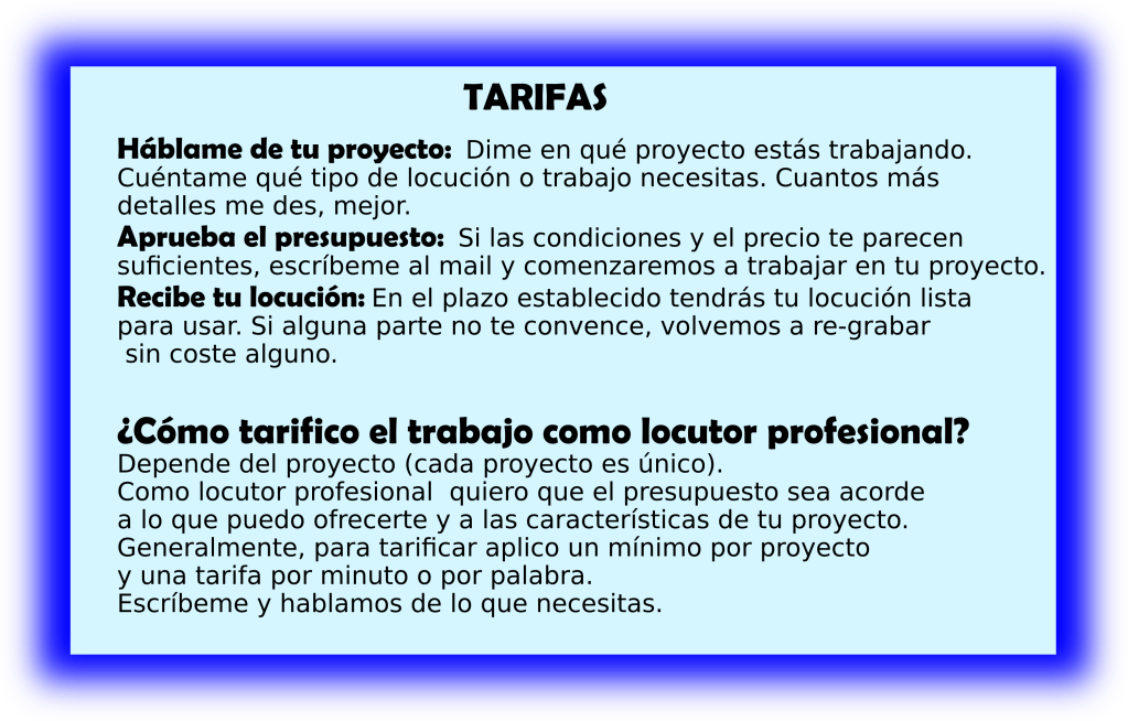 Además de la calidad de mi voz, tengo la capacidad de aplicar la entonación adecuada para generar confianza, empatía y honestidad, necesaria a la hora de transmitir cualquier mensaje, especialmente comercial, para ser recibido con agrado y convencer.